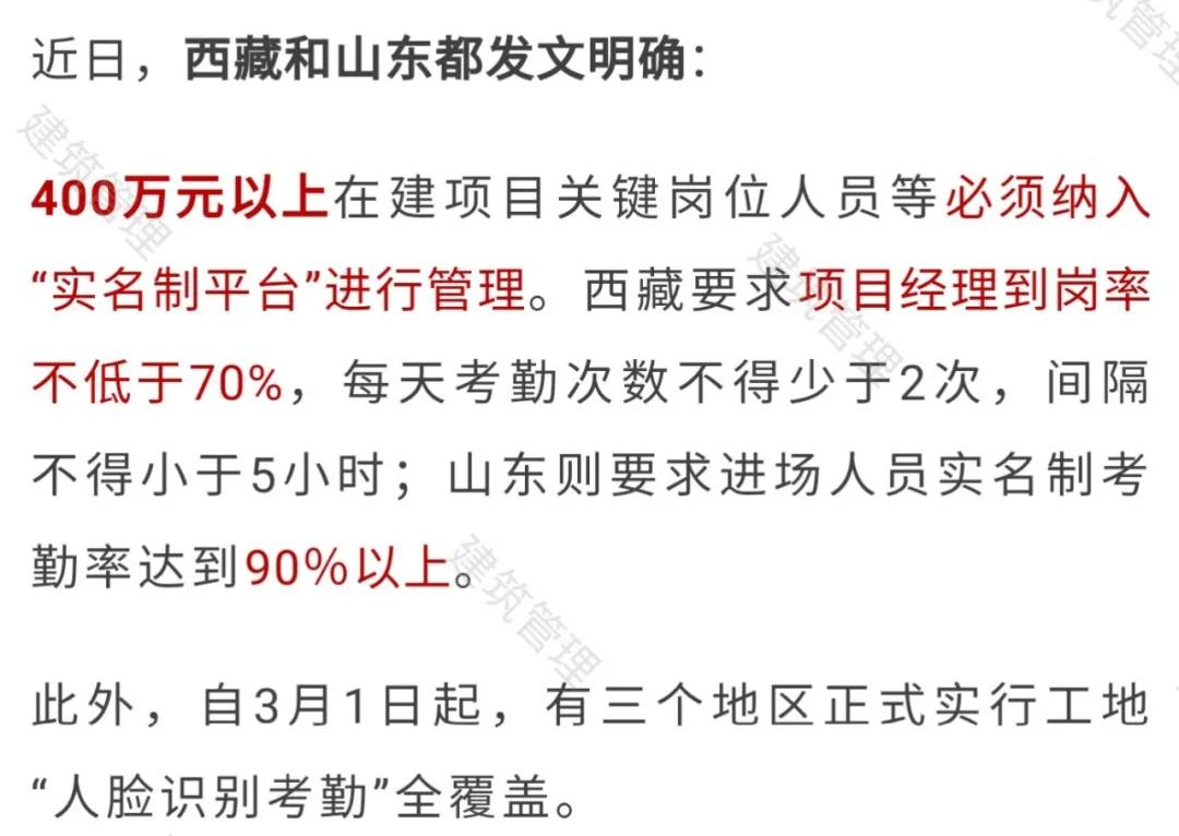 (一)在工程建設(shè)過程中,項目經(jīng)理在崗履職時間不應(yīng)少于本月施工時間的70%,總監(jiān)理工程師在崗履職時間不應(yīng)少于本月施工時間的40%(當月施工時間如無放假、請假及其他特殊原因的按照當月日歷天數(shù)計算),建設(shè)單位關(guān)鍵崗位人員到崗率不應(yīng)低于30%,整個項目關(guān)鍵崗位人員綜合到崗率不應(yīng)低于60%。對于項目關(guān)鍵崗位人員到崗率不滿足要求的,“實名制平臺”將自動生成預(yù)警,各級住房和城鄉(xiāng)建設(shè)主管部門應(yīng)對相關(guān)項目列入“重點監(jiān)管對象”。建設(shè)單位、施工企業(yè)、監(jiān)理企業(yè)及其人員在人臉識別考勤中弄虛作假、偽造的,一經(jīng)發(fā)現(xiàn),按未到崗履職處理。